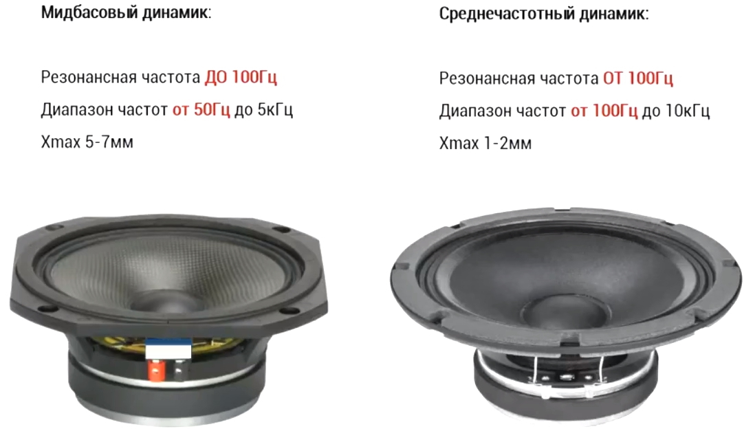 Среднечастотные динамики стоят больше мидбасовых, отличаются высокой мощностью, чувствительностью, громкостью и хорошим качеством звучания на фоне расширенного частотного диапазона. При превышении частоты 200 Гц, такая акустика будет обеспечивать яркое чистое воспроизведение, без лишних шумов. Среднечастотники не позволяют воспроизводить мягкие басы и панч. Однако колонки могут использоваться как в качестве элементов акустической системы, так и отдельно. Технически среднечастотники представляют собой конструкции с подвесом из ткани, строение которых существенно отличается от сабвуфера. Они достаточно мощные — к примеру, частотный диапазон динамиков с диаметром 16 см от 70 Гц до 13 кГц, а показатели мощности — от 60 до 200 Вт.